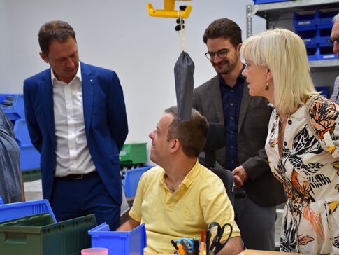 Anschließend gab es von Herrn Schreiber organisiert einen kleinen Rundgang durch unsere Nordschwäbischen Werkstätten, um einen Einblick in die Arbeit unserer Betreuten Mitarbeiter zu erhalten. Dabei ließen sich die Gäste nicht lange zurückhalten und legten bei dem ein oder anderen Arbeitsbereich kurzerhand, unter Anweisung der betreuten Werkstatt-Angestellten, selbst mit Hand an. Es war uns hierbei wichtig, den Gästen zu zeigen, wie wir das Thema Inklusion umsetzen und wie viel Mehrwert es beiden Seiten bietet, Menschen mit Behinderung die verdienten Chancen zu geben.