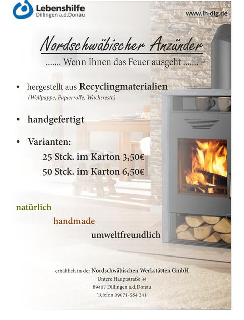 Die kalte Jahreszeit hat begonnen, die Energiepreise steigen - Zeit für unsere Nordschwäbischen Anzünder! Unsere Preise für den Anzünder bleiben günstig! Sie können die Anzünder direkt an der Pforte unserer Werkstätte in Dillingen/Hausen erwerben (Untere Hauptstraße 34, Zufahrt über Bachstraße)